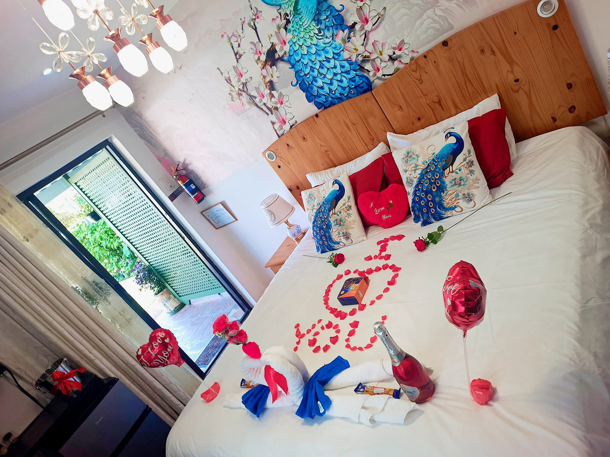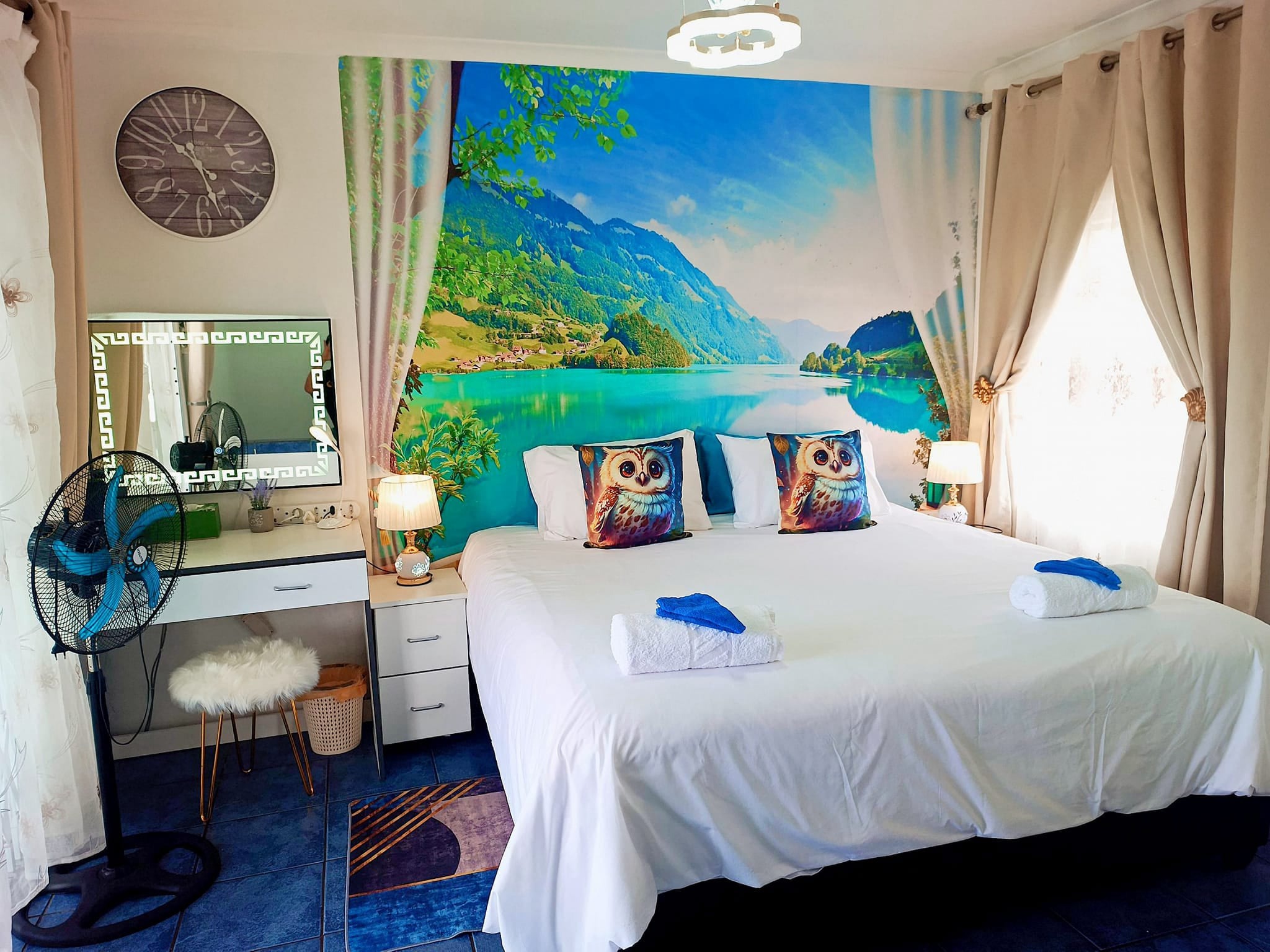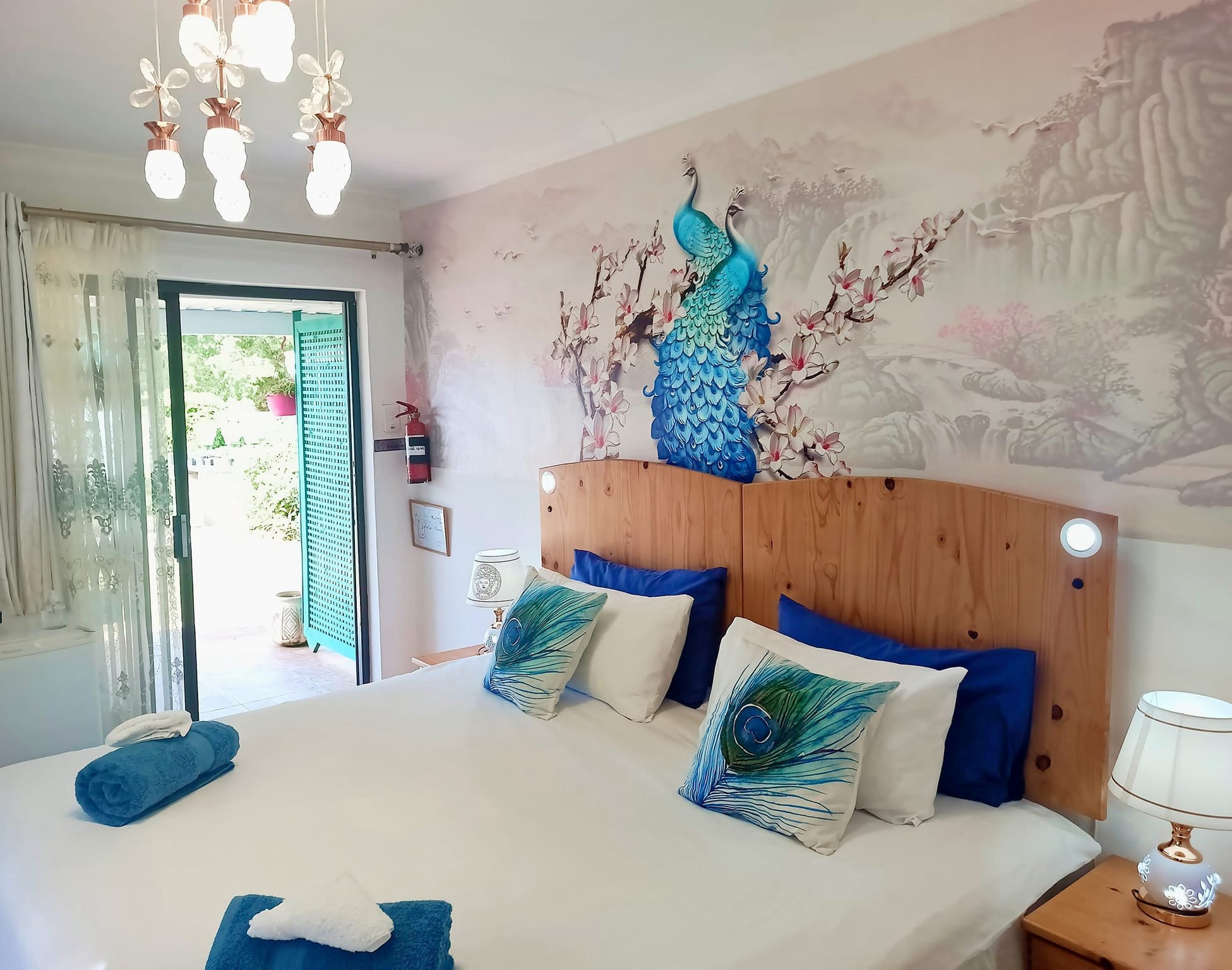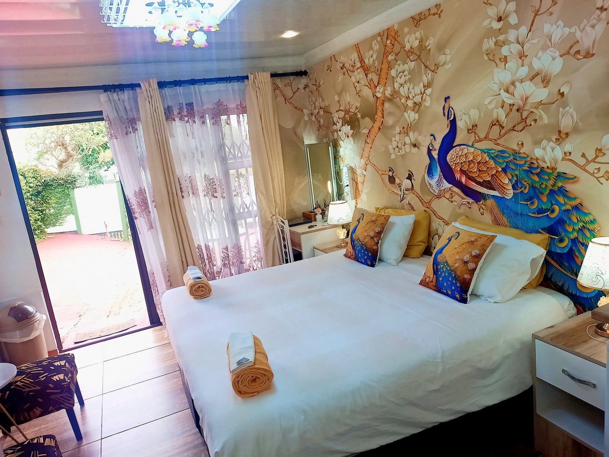 Garden Room C is perfect for the business traveler or couples with unique Decor of peacocks with a king bed or 2 singles on request, a self catering kitchenette, TV with Netflix and open-view satellite, a large bathroom with a Jacuzzi Spa bath and separate Shower, a Dressing table, or relax on the Veranda overlooking the Garden and pool area. secure parking for 1 car Read more..