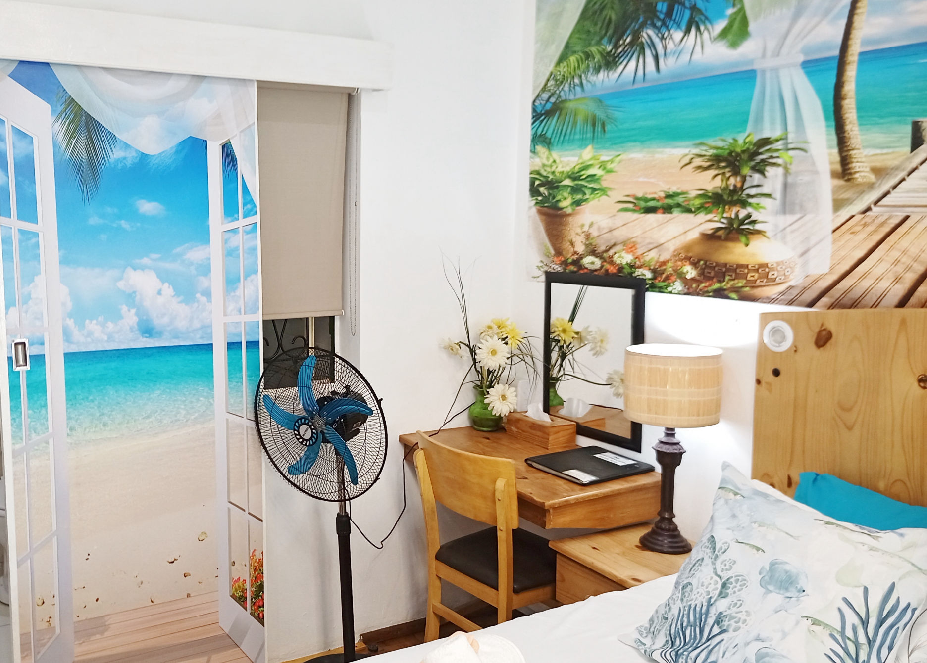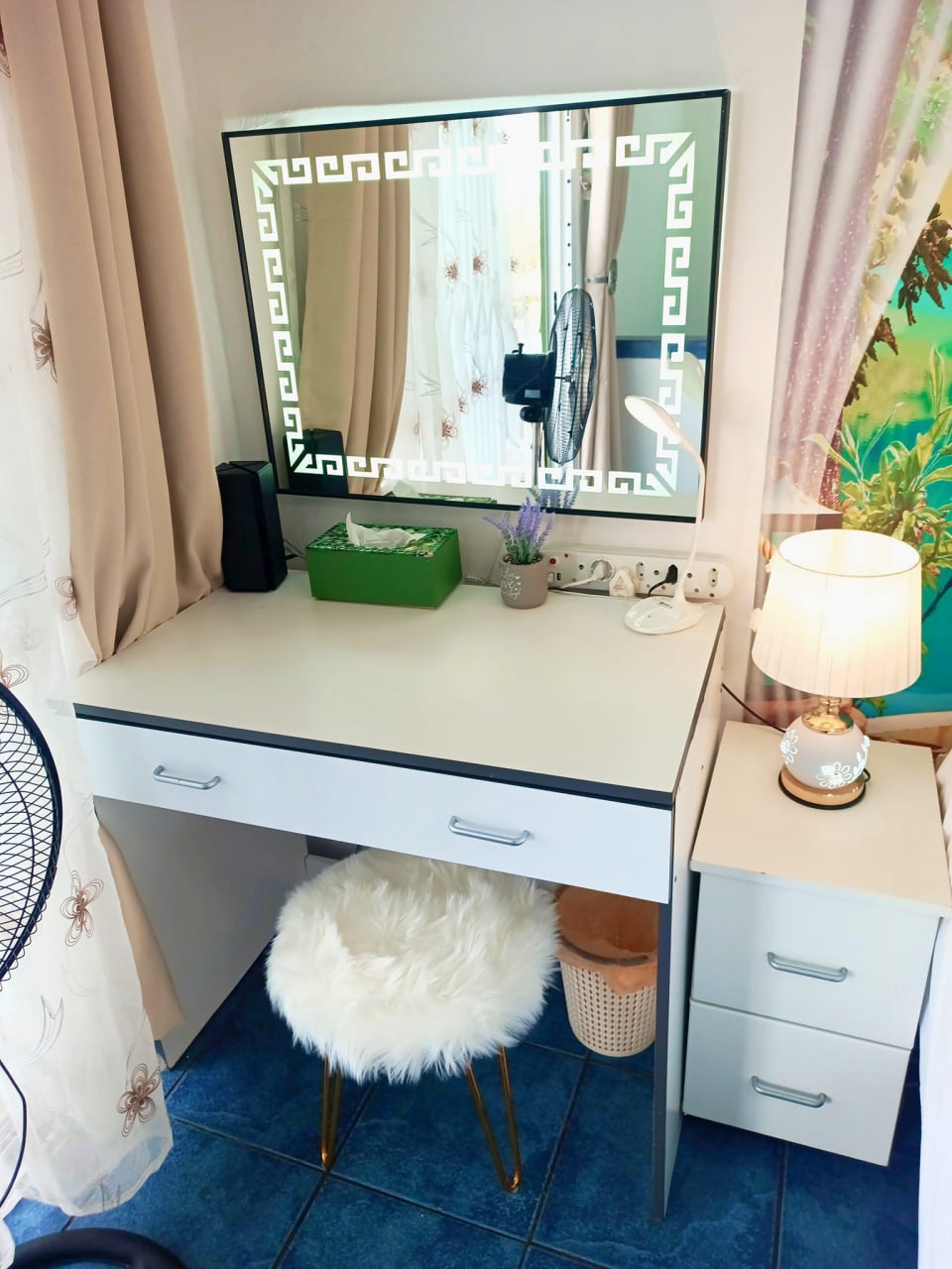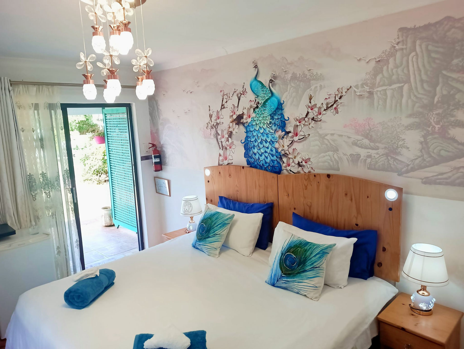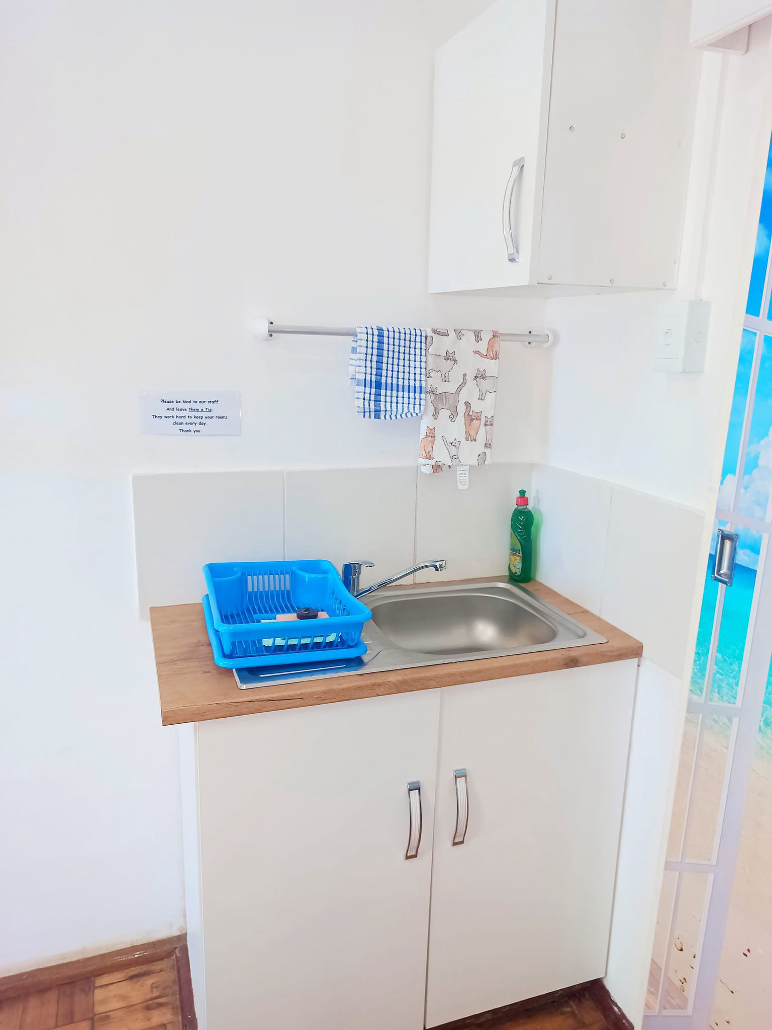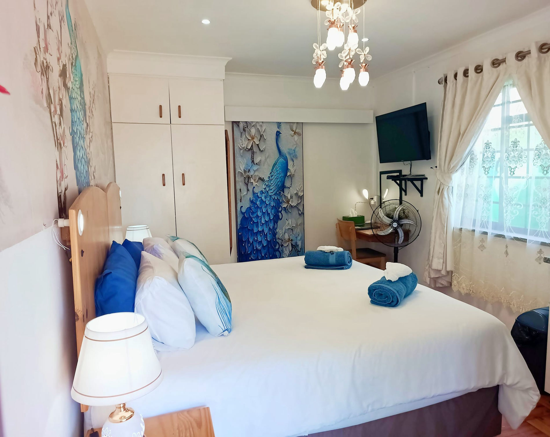 The Superior King suite has air-conditioning and offers the most modern fitting and finished of all our rooms, The Suite has to offer a King size bed or 2 singles on request, Air-conditioning, a large tv with Netflix and OVHD TV, a lightup mirror dressing table, a Fully equipped large kitchen for Self catering. a Bathroom with a walk in Shower which has a golden jet spray shower which massages your back and shoulders, And a cute Veranda. This Suite is also disabled friendly with no stairs and hand rails by the toilet and a raised toilet for the elderly.
